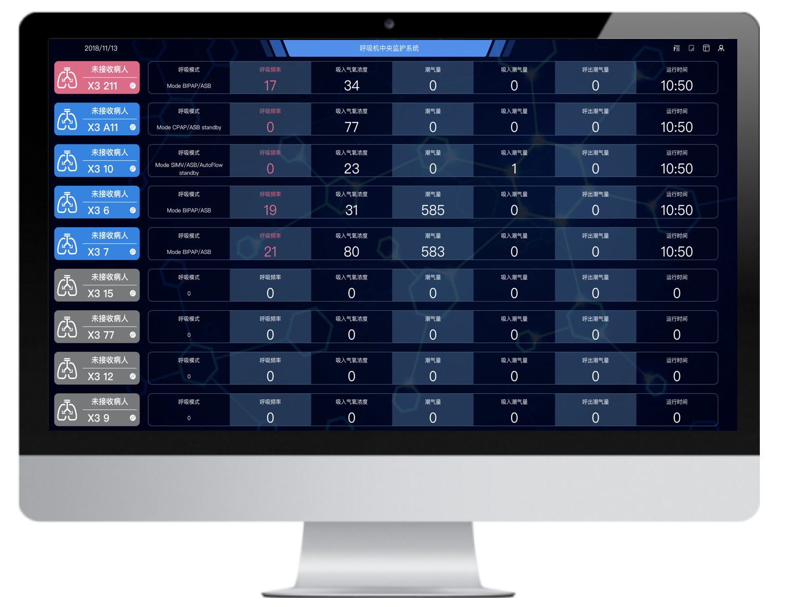 多臺不同品牌的有創(chuàng)呼吸機聯(lián)網,并通過大屏實時集中呈現(xiàn)治療預設參數(shù)和監(jiān)測參數(shù),實現(xiàn)多臺集中監(jiān)測、集中管理和數(shù)據存儲。